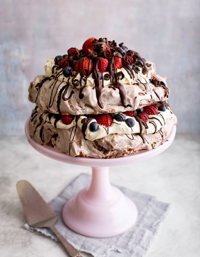 This is a spectacular dessert for any celebration. Chocolate meringue that’s crunchy on the outside and soft and fluffy on the inside, sandwiched with whipped cream, tart and sweet fresh berries, and of course, plenty of decadent chocolate.