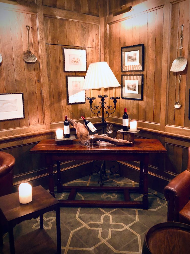 Arriving a little early for dinner, a pre-dinner cocktail in the Tea Room, located just beside reception was a must. Striking wood panelled walls complimenting the rich furnishings, complete with a roaring fire and romantic candle light makes for an extremely relaxing spot to enjoy an aperitif while perusing the impressive menu which includes a Table de Hote as well as a Blind Tasting Menu. The wine list is nothing short of magnificent with one of our all time fabvourites, ‘Cakebread’ making an appearance.